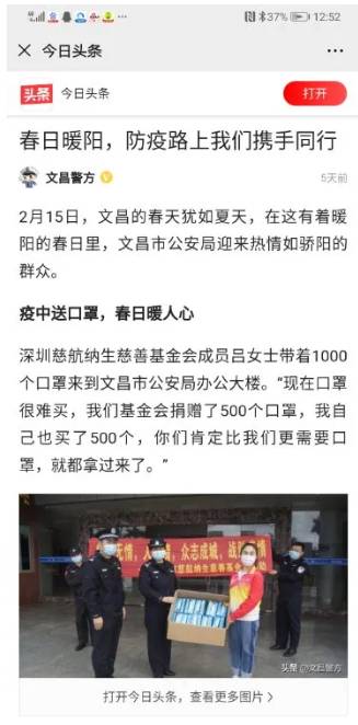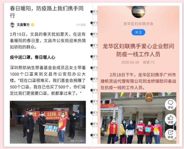 收到口罩的政府工作人員都對(duì)呂蘭瓊理事的善行表示衷心的感謝。海南新聞廣播、文昌市廣播電視臺(tái)、文昌警方、龍華區(qū)婦女聯(lián)合會(huì)等對(duì)呂蘭瓊理事以及深圳市慈航納生基金會(huì)進(jìn)行宣傳報(bào)道,弘揚(yáng)他們奉獻(xiàn)愛(ài)心、支援戰(zhàn)“疫”的正能量。